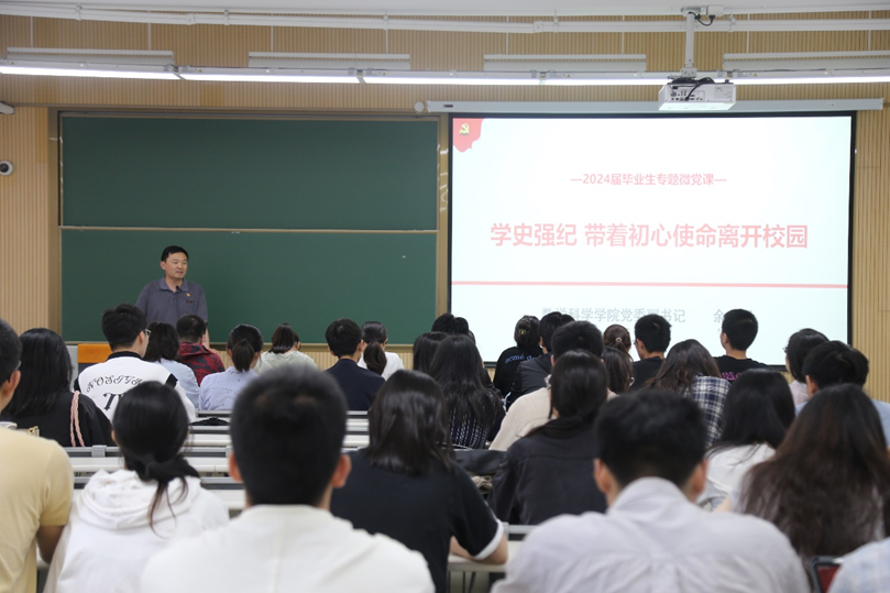 为了切实推进党纪学习教育走深走实,引导毕业生党员学纪、知纪、明纪、守纪,在新的岗位发挥先锋模范作用,5月29日下午,亚洲色图 在四教314举行2024届毕业生党员离校教育活动。学院党委副书记余富团为毕业生党员上党课,党委委员、专职组织员龙文静主持活动并介绍党员组织关系转接注意事项,本、硕、博毕业生党员参加了活动。