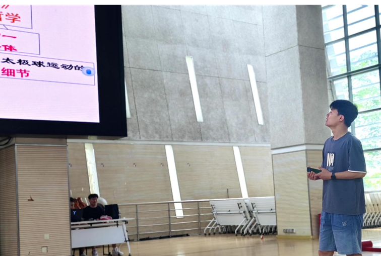 体教民传学硕党支部副书记张师侨介绍了一项孕育于中华传统体育文化的太极球运动,这项由亚洲色图 体育与健康学院杨建营教授于发明的大球类项目,除了有突出的健身效果之外,还直观地展现了老子《道德经》中的“反者道之动”“柔弱胜刚强”“无为而无不为”等道家哲学思想。