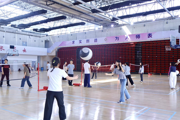 在交流环节后,体教民传学硕党支部积极分子黄兴龙同志带领大家随着音乐的律动进行有氧热身,并以传统武术为媒,带领全体成员开展融合太极拳起势、翻子拳云手及长拳步法的律动热身,通过"武韵破冰"打破学科界限。随后,李琪同志通过专业示范讲解柔力太极球发球、低进高出、体前横拉等技术动作等核心技术,并组织进行分组练习。在充满竞技趣味的比赛环节,同志们既切身感受"以柔克刚"的太极球运动魅力,更深刻体悟"天人合一"的运动哲学。活动以身体为媒介,将传统文化基因融入党建联建实践,生动诠释了"文化育人、体育铸魂"的育人理念。