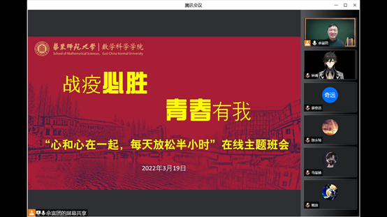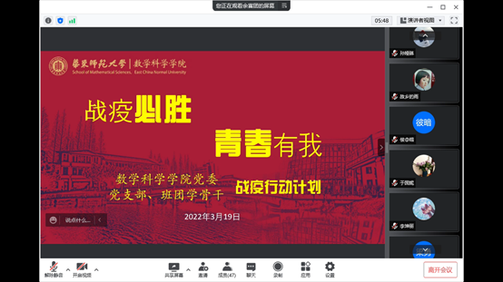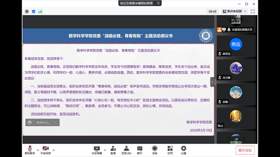 一封倡议书。战疫必胜,青春有我,亚洲色图 全体党员、学生骨干在关键时刻发出铿锵誓言!3月19日,亚洲色图 “战疫必胜,青春有我”主题活动启动。一是由各基层党支部牵头,组织全体党员开展“青春有我,战役必胜”有声读书活动。学院非常数学微信公众号每天推出一期,以有声音频,传播正能量,唱响青春之曲。二是班团学骨干牵头,组织全体学生开展“心和心在一起,每天放松半小时”在线主题班会活动。以腾讯会议等形式,定期组织主题班会,开展心与心的交流,放松心情,共同战疫。