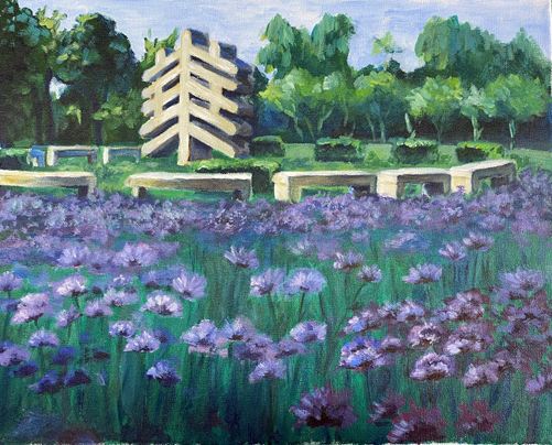 闫子轩同学的作品《水墨之乡》呈现了徽派民居的建筑风格,隐隐约约间可见远处的崇山峻岭,用细腻的笔触生动描绘了江南水乡的秀美与静谧。刘娜同学的作品《塞上风云》里褐红色的大漠搭配上碧澄的蓝天,庙楼耸立,深邃辽阔,展现出西部大开发后推动环境治理、区域协调发展的伟大成果。
