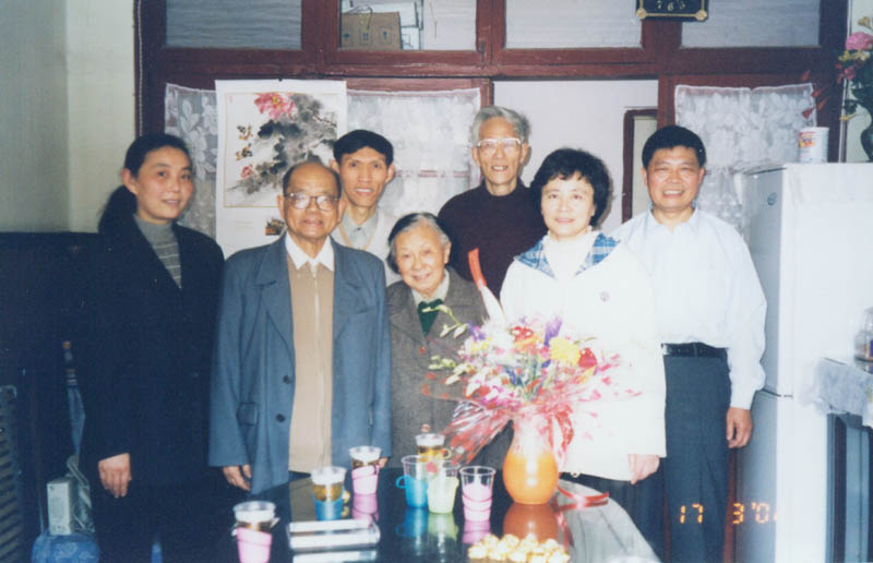 左图是与邹一心合影(1997);右图是2002年数学教材编写组为陈昌平先生庆贺合影。 前排左起:胡平、陈昌平、李汉佩、周齐;后排左起:忻重义、邹一心、吴炳煌