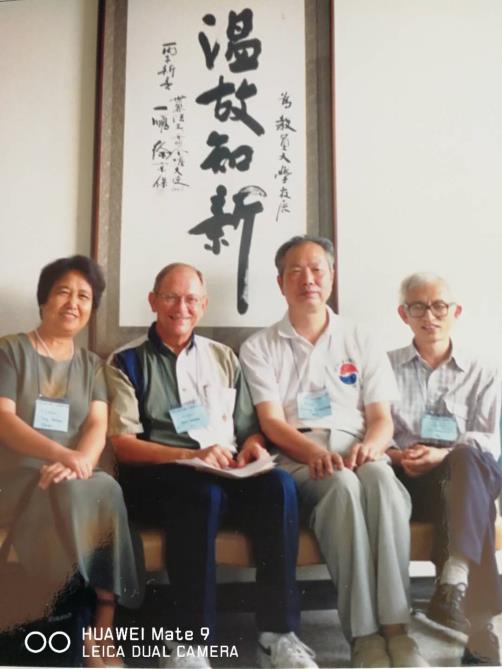 1996年我和张奠宙老师在西班牙参加第8届国际数学教育大会期间与国际数学教育委员会主席(左1)和秘书长(左3)合影