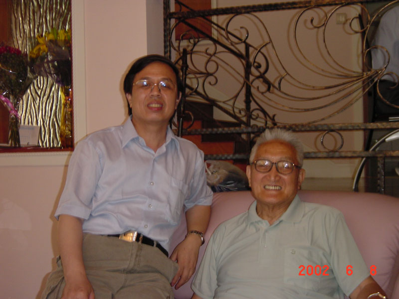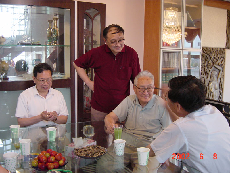 左图:2002年的全国第八届代数学学术会议(苏州)期间,曹先生携王建磐、林磊和华东师大的研究生合影 右图:在王建磐家的聚会上,曹先生与陈志杰、刘昌堃、叶家琛在交谈