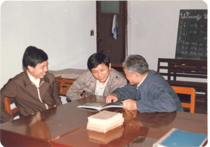 左图:曹先生和学生王建磐、时俭益、杜杰在一起讨论问题 右图:曹先生和肖刚、王建磐在一起