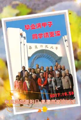 今年是我们毕业六十周年,借着数学系校友联谊会成立之际,我们决定在十月二十八日举行毕业六十周年的第十二次聚会。发了通知,75个人(其中1班13人、2班15人、3班13人、4班14人、5班20人)有六十七人给回应,虽然不少人因健康之故请假不能来,但都表达了对聚会的向往和遗憾之情,并衷心祝愿聚会成功和对老同学健康的关切之意,也有些是因无人陪同而不能与会。老同学完全能理解,毕竟都是八十岁以上的老人需要家人的陪伴才能行动的。这次与会的共十九人,他们是:北京的张澍芗夫妇、西安的张肇炽夫妇(大家祝贺他们新婚幸福)、苏州的闻保坚、刘德珍夫妇(女儿陪同)、温岭的叶恩光夫妇、临沂的叶伯诚(儿子陪同),只有张家港的刘儒华和杭州的刘镇国是一个人来的,他们的健康是同学们很钦佩和羡慕的;上海的宋虎盛由儿子陪来,其余的董纯飞、秦亚林、金志华、徐玉芬、刘红珠、鲍修德、李绍芬、方朝臣、曹春荣和吴光焘(鲍李借了个轮椅来助步)都是一个人来的,看来健康还是可以的(当然各人病痛还是有的)。叶景蕴给老同学写了封信表心意,王惠秋快递给与会同学她手装的每人一小袋糖果和长生果,还在群里发《同学之歌》,并把歌谱复印给大家,友谊之情的深厚让人感动。