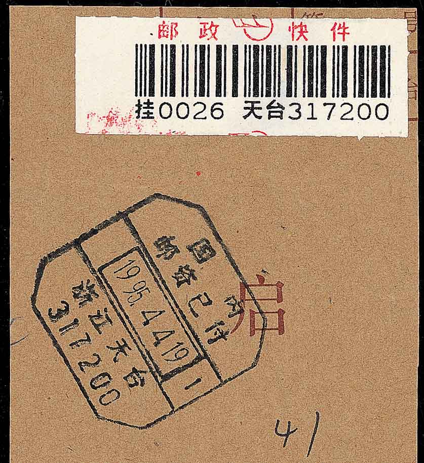 一组数字用条形码的形式来替代,是为了便于计算机的探头快速识别。比如在超市里,每一件商品的标签上,除了注明商品的名称、数量、价格以外, 还印有一组条形码(即该商品的数字代码)。收银员用收银计算机上的探头对准条形码扫描一下,在显示屏上就出现了你所购买商品的名称和价格。 这种利用条形码的方法在其他领域也被广泛使用。如在邮政部门,它的各项业务也都分别设定了一组数字代码,并转换成条形码。 图1(中国,1995)上的条形码表明它是浙江天台寄出的邮政快件,图2(中国,2002)上的条形码是北京寄出的挂号邮件。因此,计算机和条形码使各项邮政业务更加科学,更加便捷。