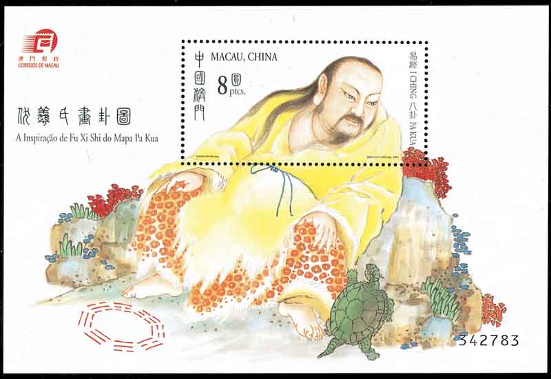 西方认为,二进位制是德国科学家莱布尼茨(Leibniz,1646-1716,图3)发明的。其实二进位制在中国早有记载。它表现在八卦中,相传八卦是伏羲所造, 图4是中国澳门邮票,它的画面是“伏羲画卦图”。八卦就是由长短划不同排列组合而成的符号。每一卦都由阳爻(—)和阴爻(- -)构成。如果分别记它们为1和0, 那么由图5(中国澳门邮票),看到第一卦乾卦 1111112 换算成十进制是 25+24+23+22+21+20=63, 下面依次是 0111112=31, 1011112=47,0011112=15, 1101112=55, 0101112=23,1001112=39, 0001112=7。