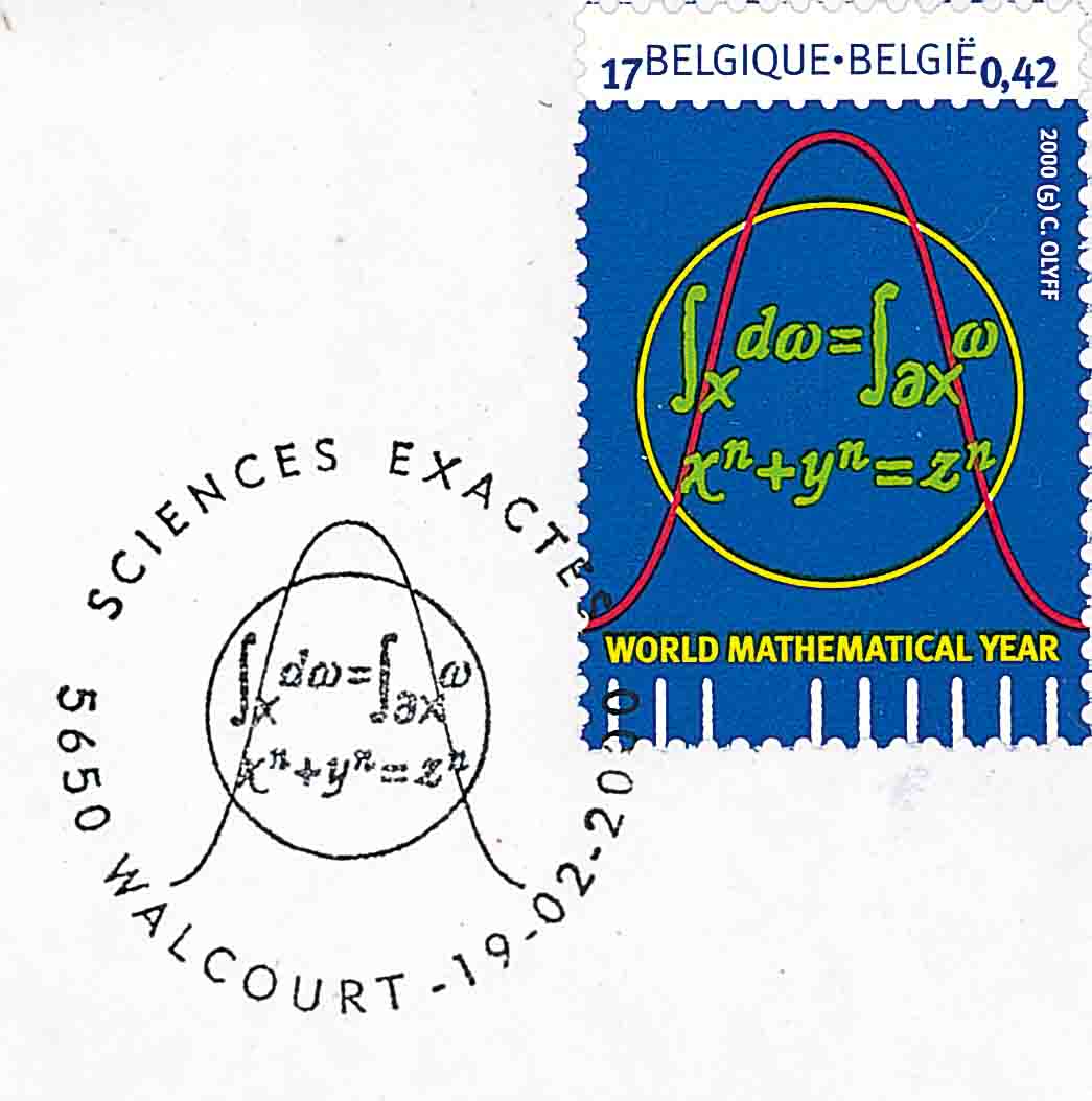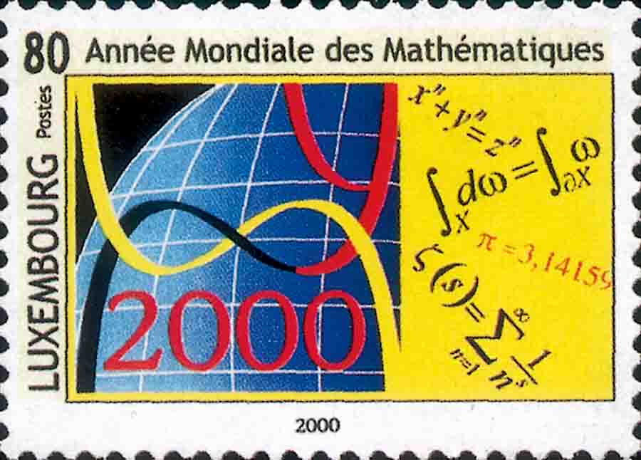 根据国际数学联合会的提议, 联合国科教文组织确定 2000 年为``世界数学年''. 其目的在于提高数学在整个社会中的能见度. 为此, 好些国家的邮政部门相继发行纪念邮票, 以加强宣传, 推动此项工作的进行. 其中有: 摩纳哥 (图 1)、 斯洛伐克 (图 2)、 比利时邮票和首日邮戳 (图 3)、 卢森堡 (图 4)、 阿根廷 (图 5)、 捷克 (图 6) 等等. 这些国家都力图在邮票图案上展示有关数学的符号和信息, 其中以费马大定理倍受许多国家的关注 (如: 图 3、图 4、图 6).