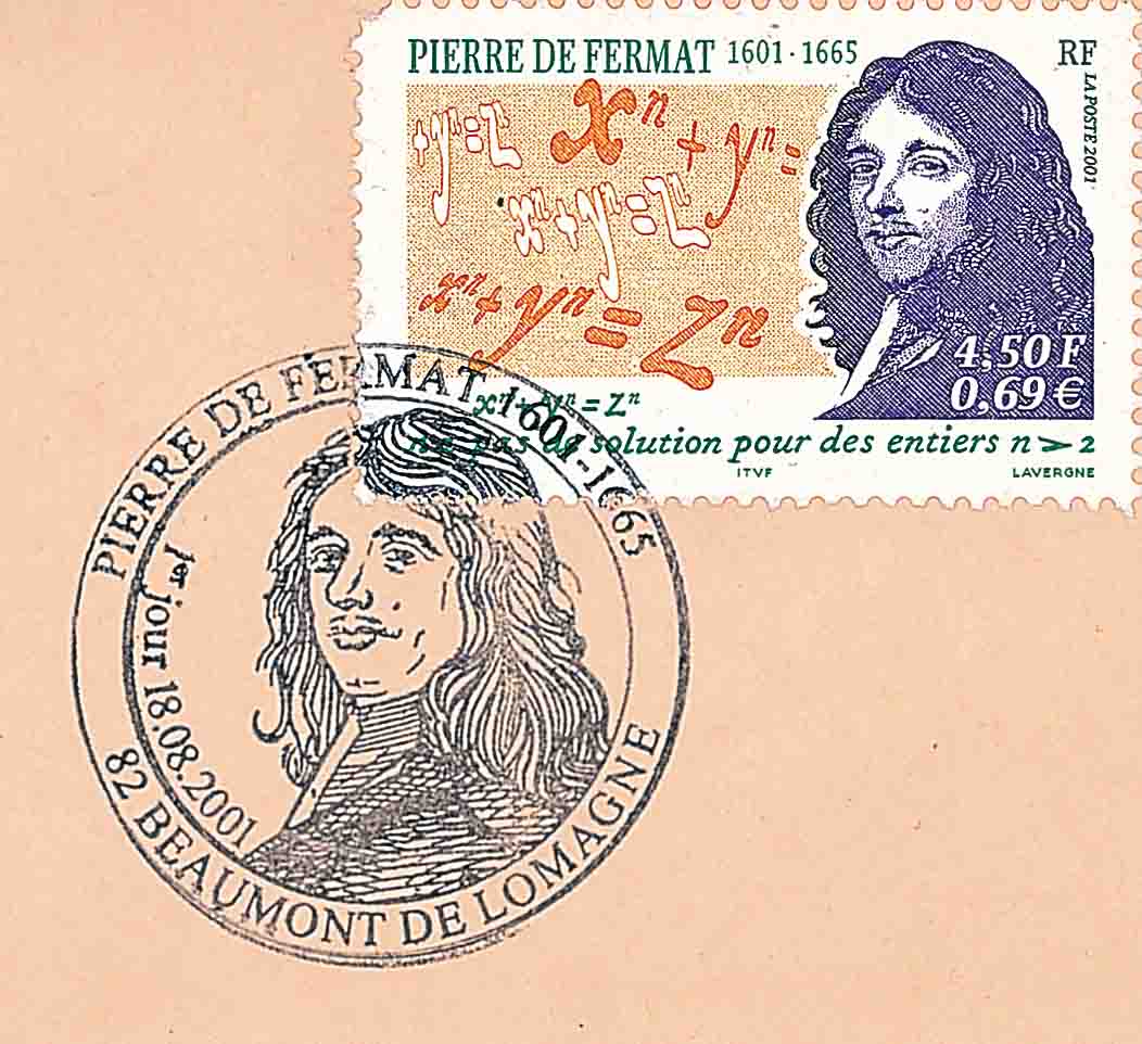 图 7 是 2001 年法国发行的费马与费马大定理纪念邮票及其首日邮戳.