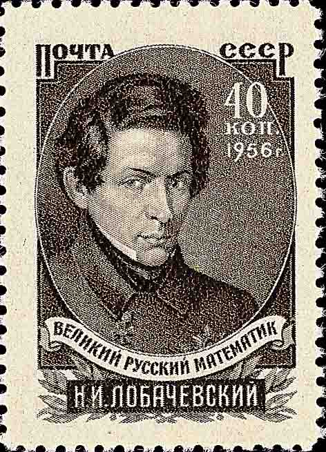 非欧几里得几何的诞生有着许多富有故事性的曲折过程. 首先是历史上好些数学家提出, 欧几里得几何的第五公设 (平行公理: 若一直线与两直线相交, 所构成的两个同侧内角之和小于直角, 则这两直线的延长线一定在那两内角侧相交.) 能不能不作为公设, 而作为定理? 或者说能不能依靠前四个公设来证明第五公设? 因为这个公设从语句上看像是个可以证明的定理. 许多年来, 人们投入了无数的精力, 尝试了各种可能的方法, 但都未能成功. 这就是几何发展史上著名的关于``平行线理论''的研究. 俄罗斯数学家、 喀山大学校长罗巴切夫斯基 Николай Иванович Лобачевский, (1792--1856), 图1和图 2 分别是前苏联 1951 年和 1956 年发行的纪念罗巴切夫斯基的邮票) 从 1815 年起着手研究平行线理论. 开始他也是循着前人的思路, 试图给出对第五公设的证明. 但他很快就发现这条路走不通. 并推理出: ``第五公设不能被证明''的重要结论. 与此同时他创建一个新的平行公理, 即: 通过直线外一点至少有两条直线与已知直线平行. 它与欧几里得几何其他四个公理一起构成新的公理体系, 形成了新的理论, 它也和欧几里得几何一样是完善的、严密的几何学, 被世人称为罗巴切夫斯基几何. 1826 年 2 月 23 日, 罗巴切夫斯基在喀山大学物理数学系学术会议上, 宣读了他的论文: 《几何学原理及平行线定理严格证明的摘要》. 这篇创造性论文的问世, 标志着非欧几里得几何的诞生. 然而, 这一重大成果在公诸于世时, 遭到当时许多传统数学家的冷漠和反对, 甚至遭到匿名者的攻击, 但他仍然继续探索新几何的奥秘. 并于 1829 年, 在《喀山大学通报》发表了题为《几何学原理》的论文. 这篇论文重述了第一篇论文的基本思想, 并作了补充和发展.
