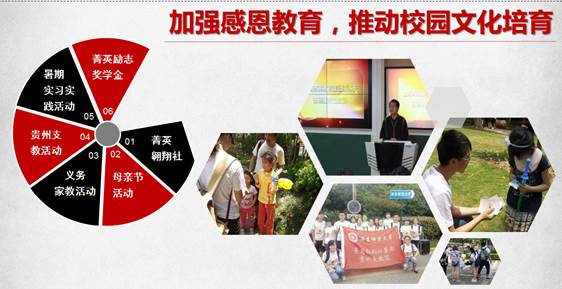 学院注重加强受奖、受助对象的感恩教育,推动感恩和积极向上校园文化的培育,2017年组织了义务家教、贵州支教以及暑期实习实践活动,使参与同学切身感受到在受助中要懂得回馈社会,在助人中可以赠人玫瑰、手留余香,养成乐于助人、积极向上的世界观、人生观和价值观。