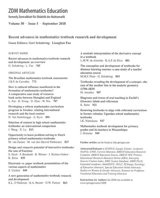 ZDM第50卷第5期的主题是“数学教材研究和发展的最新进展“,共刊载了15篇论文。亚洲数学教育中心主任范良火教授与德国Bielefeld大学的Schubring教授是该期的特邀主编,他们合作的调查论文(Survey Paper)梳理了该领域研究的有关历史和最新进展。另外,范教授、熊斌教授、赵冬臣副教授(哈尔滨师范大学)和牛伟强博士生合作发表的研究论文《How is cultural influence manifested in the formation of mathematics textbooks? A comparative case study of resource book series between Shanghai and England》(《文化影响是如何体现在数学教材的形成过程中的——上海与英国系列教材比较案例研究》),从文化视角探讨了数学教材的开发问题,通过中国和英国版的数学《一课一练》这一特殊案例,在国际上首次实证性地研究了文化对数学教材形成的实际影响。王建磐教授和鲁小莉博士后发表的研究论文 《Selection of content in high school mathematics textbooks: an international comparison》(《高中数学教材内容的选择:不同国家数学教材的比较》),从代数、几何、统计与概率、微积分4个核心领域,比较了中国、法国、德国、日本、俄罗斯、英国和美国高中教材的选读内容及其呈现方式并讨论了该分析结果对中国高中数学课程改革,特别是对改革过程中教科书发展的影响。