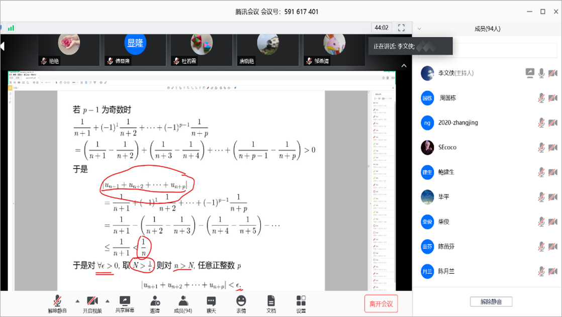 公开课上,李文侠主要讲述《高等数学A》第十一章、第二节正项级数敛散性的判别问题。他首先证明了非最终定号级数等价于交错级数,从而将级数分为两类:正项级数和交错级数。接着介绍了正项级数的收敛准则,以此为出发点介绍了若干判别正项级数敛散性的方法并举例说明如何使用这些方法来判断正项级数的敛散性。此次公开课,李文侠采用常用的腾讯会议进行直播,边讲边批注,PPT屏幕共享,整堂课一气呵成,自然流畅,重点问题突出,难度逐步加深,充分显示了课程的充分准备和主讲人的从容驾驭。