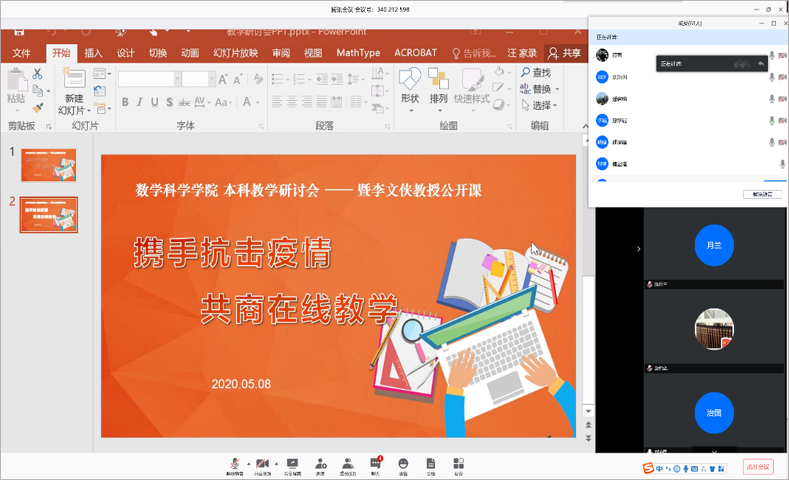 课后,学院副院长潘建瑜主持召开了主题为“携手抗击疫情,共商在线教学”的教学研讨会,与会老师们进行了热烈的讨论与交流。老师们纷纷表示,李老师的这种腾讯会议直播方式比较适合数学教学,可以将证明推演的过程完整呈现给同学们。大家还表示,云端授课要基于充分的课前准备,课堂的进度把控要更精准,现场要与同学们更积极地交流互动,提高课堂效果。