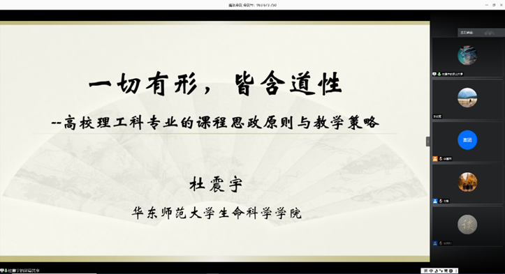 杜震宇教授从课程思政的内涵及理工科教师开展课程思政常有的困惑,结合理工科课程的专业特征与课程思政的统一性,围绕“课程思政是否会冲击理工科的专业知识体系?”“课程思政内容如何与专业知识体系兼容乃至融合?”“理工科课程中实施课程思政教学的原则和具体教学策略是什么?”等方面为大家做了经验分享。杜教授认为理工科的课程思政具有普适性、专业性、间接性、便利性、亲和性、牢固性六大特征,教学策略应强调“发掘知识体系中天然自带的科学理性价值观”、“彰显科学发展中时时闪耀的先辈楷模示范性”、“突出专业设置中无处不在的国计民生关联度”、“强化实践实验中真实可信的事业生活指导感”,提出六尚(亲、新、变、润、实、专)六忌(离、旧、僵、硬、浮、滥)原则。 他以自己的课程为例,阐释了课程思政的本质就是教书育人,需要教师坚守育人的信念,“心中有道,处处是道”。