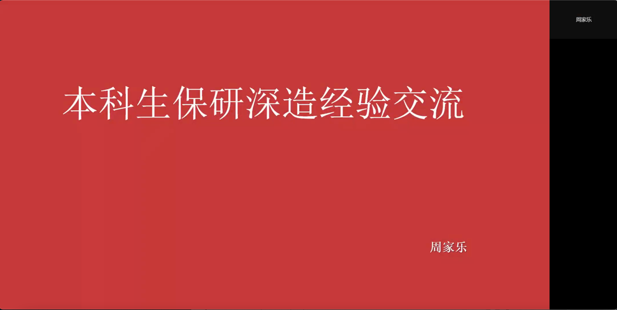 第二位进行分享的是保送到本校数学专业读研的2019级拔尖班学生周家乐。他介绍了本校推免的程序,告诉同学们要通过劳逸结合来提高学习效率。周家乐还建议同学们在疫情下保持良好的作息方式,多与同学和老师沟通。