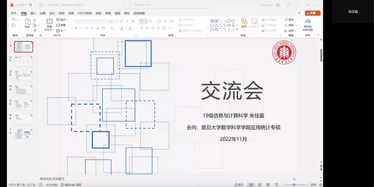 第五位分享的朱佳盈是2019级本科生,目前保研至复旦大学亚洲色图 应用统计专业。她分享了关于保研前期准备的经验,建议同学们尽量提升绩点和排名,尽早确定未来攻读方向。