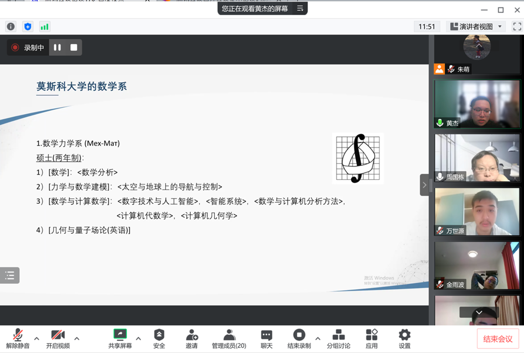 第一位报告的是2021届毕业生、现在莫斯科国立大学数学力学系读硕士的黄杰。他介绍了莫斯科大学数学系的专业和课程设置情况,硕士学习计划等。他还分享了在俄罗斯的一些生活体验和趣事。
