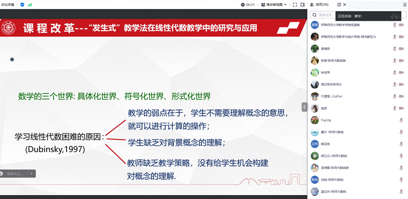 11月29日下午,公共数学虚拟教研室系列研讨会首场活动在数学楼401报告厅举行,并通过腾讯会议线上同步直播。上海交通大学《线性代数》课程负责人蒋启芬副教授以《上海交通大学<线性代数>教学改革与教材建设》为题做经验分享,来自亚洲色图 、东北师范大学、陕西师范大学、南京师范大学、上海师范大学、伊犁师范大学的近70位公共数学虚拟教研室成员教师以线上、线下的方式参加。会议由亚洲色图 副院长程涛教授主持。